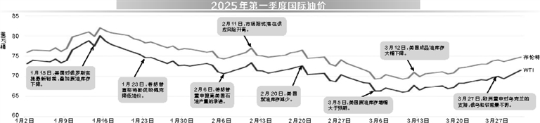 第一季度,地缘政治因素支撑国际油价一度涨至82.03美元/桶。特朗普正式就任美国总统,开启加征关税进程,拖累全球经济和石油需求,并出手调停俄乌冲突,国际油价震荡下行。1月,欧美多地极寒天气持续提振取暖油需求,美国针对俄罗斯石油收入实施迄今为止最严厉的制裁措施,布伦特原油期货均价升至78.35美元/桶。2月,市场担忧美国开启加征关税进程将拖累全球经济和石油需求,叠加俄乌和谈可能性上升令地缘局势缓和,布伦特原油期货均价降至74.95美元/桶。3月,特朗普持续加码对外关税,“欧佩克+”意外宣布如期从4月开始退出减产计划,布伦特原油期货均价进一步降至71.47美元/桶。今年第一季度,布伦特原油期货均价为74.98美元/桶,环比上涨0.97美元/桶(涨幅达1.31%),同比下降6.78美元/桶(降幅达8.29%)。